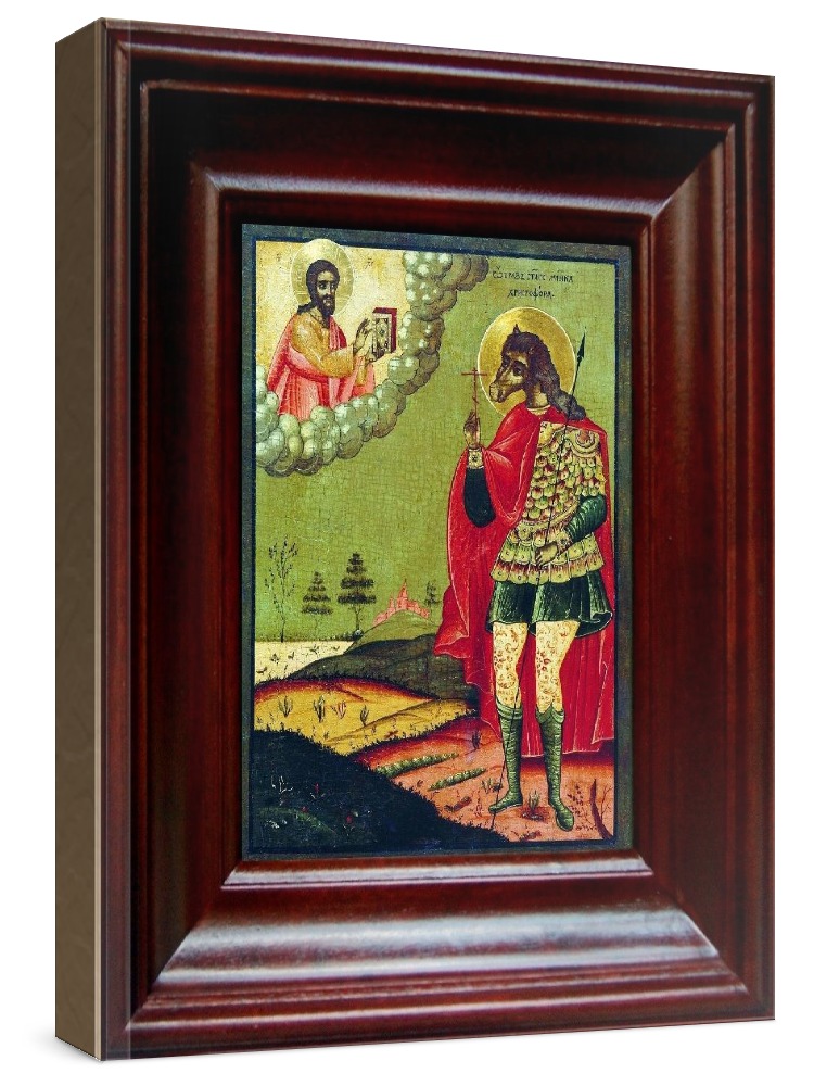Икона христофор псеглавец (21х24), простой киот. Икона выполняется на заказ. Срок изготовления - 2-5 дней. Лик нанесен методом шелкографии на цельную липовую доску, покрытую левкасом (специальным грунтом под живопись). Использованы минеральные (природные) краски. Размер иконы без киота (см): 13х16, с киотом: 21х24. Киот (рамка) выполнен из березы. Икона освящена.