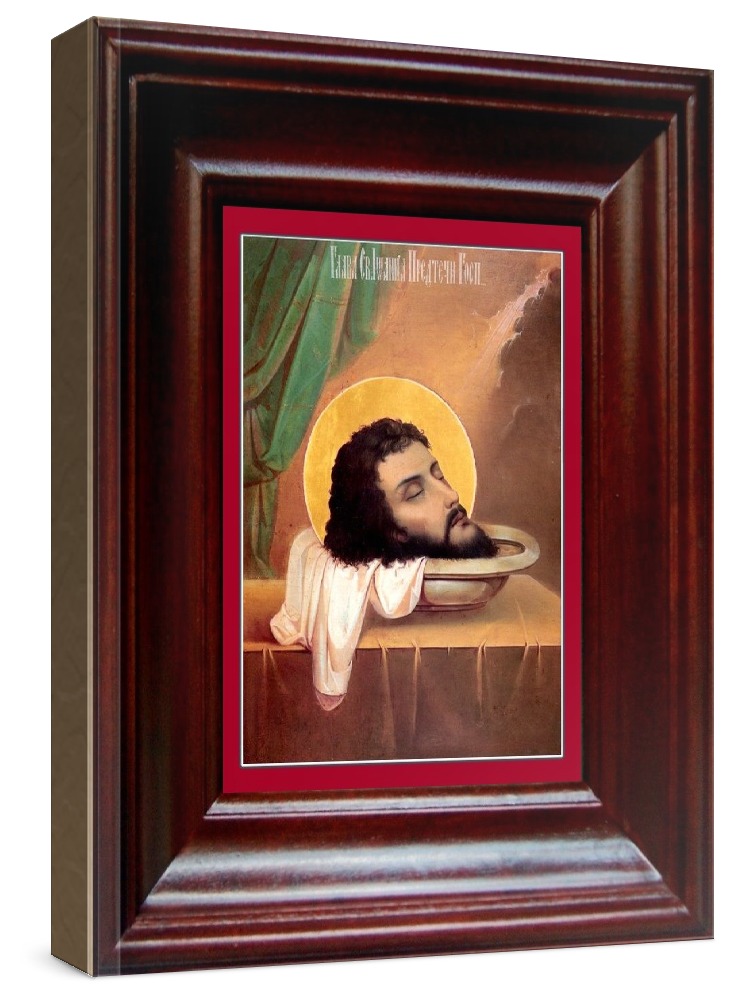Икона глава иоанна предтечи (21х24), простой киот. Икона выполняется на заказ. Срок изготовления - 2-5 дней. Лик нанесен методом шелкографии на цельную липовую доску, покрытую левкасом (специальным грунтом под живопись). Использованы минеральные (природные) краски. Размер иконы без киота (см): 13х16, с киотом: 21х24. Киот (рамка) выполнен из березы. Икона освящена.