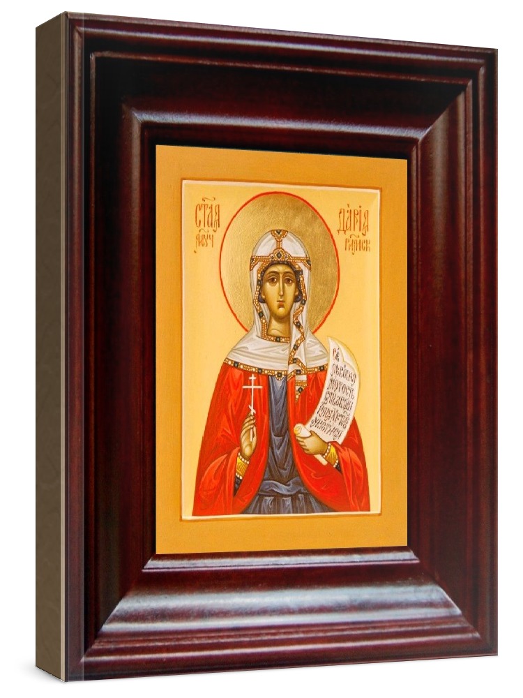 Икона дария римская (21х24), простой киот. Икона выполняется на заказ. Срок изготовления - 2-5 дней. Лик нанесен методом шелкографии на цельную липовую доску, покрытую левкасом (специальным грунтом под живопись). Использованы минеральные (природные) краски. Размер иконы без киота (см): 13х16, с киотом: 21х24. Киот (рамка) выполнен из березы. Икона освящена.