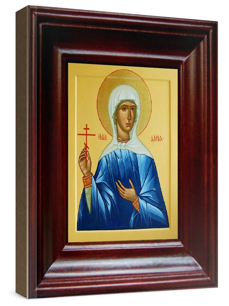 Икона дария римская (21х24), простой киот. Икона выполняется на заказ. Срок изготовления - 2-5 дней. Лик нанесен методом шелкографии на цельную липовую доску, покрытую левкасом (специальным грунтом под живопись). Использованы минеральные (природные) краски. Размер иконы без киота (см): 13х16, с киотом: 21х24. Киот (рамка) выполнен из березы. Икона освящена.