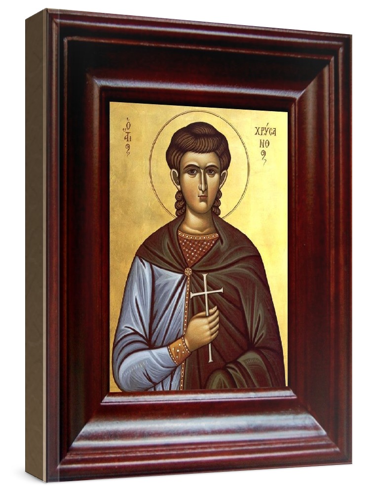 Икона хрисанф римский (21х24), простой киот. Икона выполняется на заказ. Срок изготовления - 2-5 дней. Лик нанесен методом шелкографии на цельную липовую доску, покрытую левкасом (специальным грунтом под живопись). Использованы минеральные (природные) краски. Размер иконы без киота (см): 13х16, с киотом: 21х24. Киот (рамка) выполнен из березы. Икона освящена.
