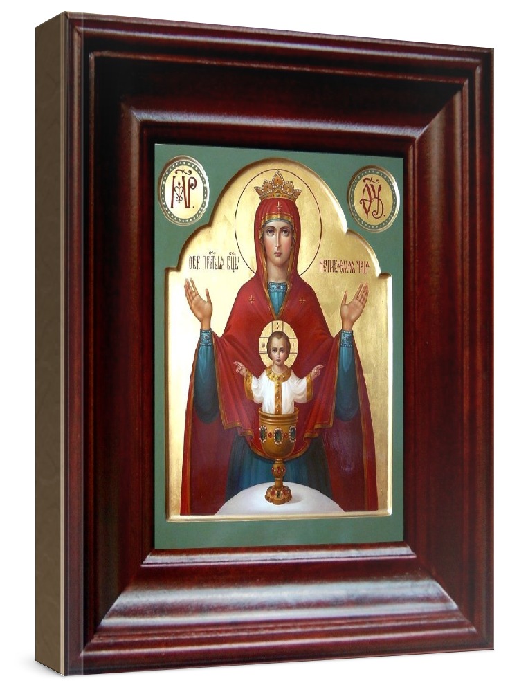 Икона неупиваемая чаша (21х24), простой киот. Икона выполняется на заказ. Срок изготовления - 2-5 дней. Лик нанесен методом шелкографии на цельную липовую доску, покрытую левкасом (специальным грунтом под живопись). Использованы минеральные (природные) краски. Размер иконы без киота (см): 13х16, с киотом: 21х24. Киот (рамка) выполнен из березы. Икона освящена.