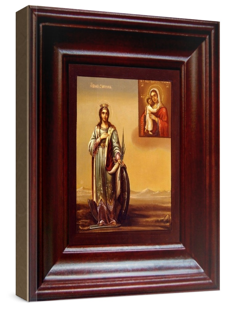 Икона екатерина александрийская (21х24), простой киот. Икона выполняется на заказ. Срок изготовления - 2-5 дней. Лик нанесен методом шелкографии на цельную липовую доску, покрытую левкасом (специальным грунтом под живопись). Использованы минеральные (природные) краски. Размер иконы без киота (см): 13х16, с киотом: 21х24. Киот (рамка) выполнен из березы. Икона освящена.