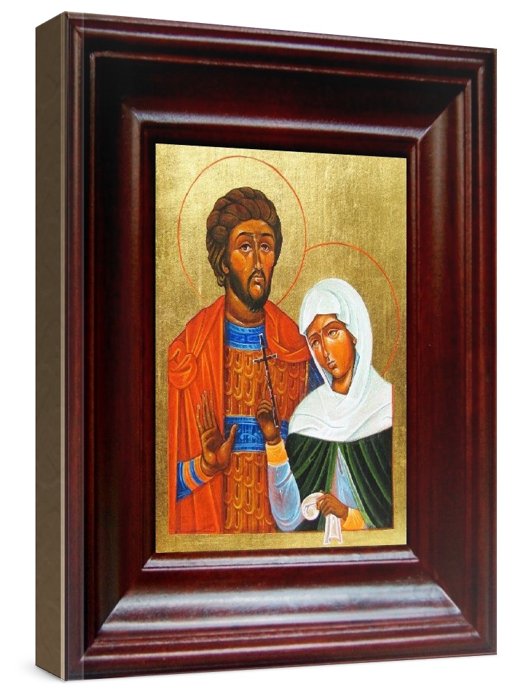 Икона адриан и наталия (21х24), простой киот. Икона выполняется на заказ. Срок изготовления - 2-5 дней. Лик нанесен методом шелкографии на цельную липовую доску, покрытую левкасом (специальным грунтом под живопись). Использованы минеральные (природные) краски. Размер иконы без киота (см): 13х16, с киотом: 21х24. Киот (рамка) выполнен из березы. Икона освящена.