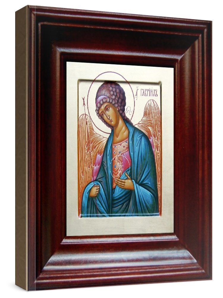 Икона гавриил архангел (21х24), простой киот. Лик нанесен методом шелкографии на цельную липовую доску, покрытую левкасом (специальным грунтом под живопись). Использованы минеральные (природные) краски. Размер иконы без киота (см): 13х16, с киотом: 21х24. Киот со стеклом, выполнен из березы. Икона освящена.