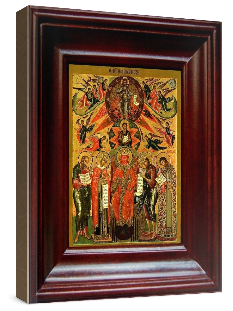 Икона софия-премудрость божия (новгородская) (21х24), простой киот. Лик нанесен методом шелкографии на цельную липовую доску, покрытую левкасом (специальным грунтом под живопись). Использованы минеральные (природные) краски. Размер иконы без киота (см): 13х16, с киотом: 21х24. Киот со стеклом, выполнен из березы. Икона освящена.