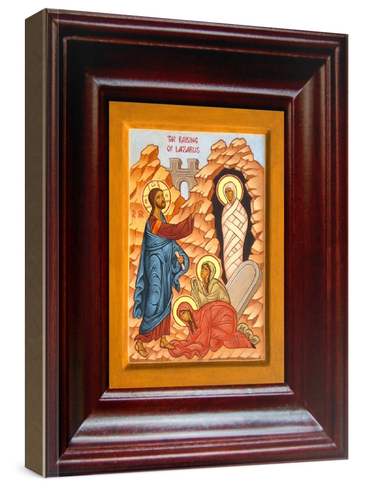 Икона воскрешение лазаря (21х24), простой киот. Лик нанесен методом шелкографии на цельную липовую доску, покрытую левкасом (специальным грунтом под живопись). Использованы минеральные (природные) краски. Размер иконы без киота (см): 13х16, с киотом: 21х24. Киот со стеклом, выполнен из березы. Икона освящена.