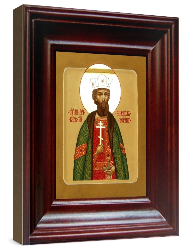 Икона михаил черниговский (21х24), простой киот. Лик нанесен методом шелкографии на цельную липовую доску, покрытую левкасом (специальным грунтом под живопись). Использованы минеральные (природные) краски. Размер иконы без киота (см): 13х16, с киотом: 21х24. Киот со стеклом, выполнен из березы. Икона освящена.