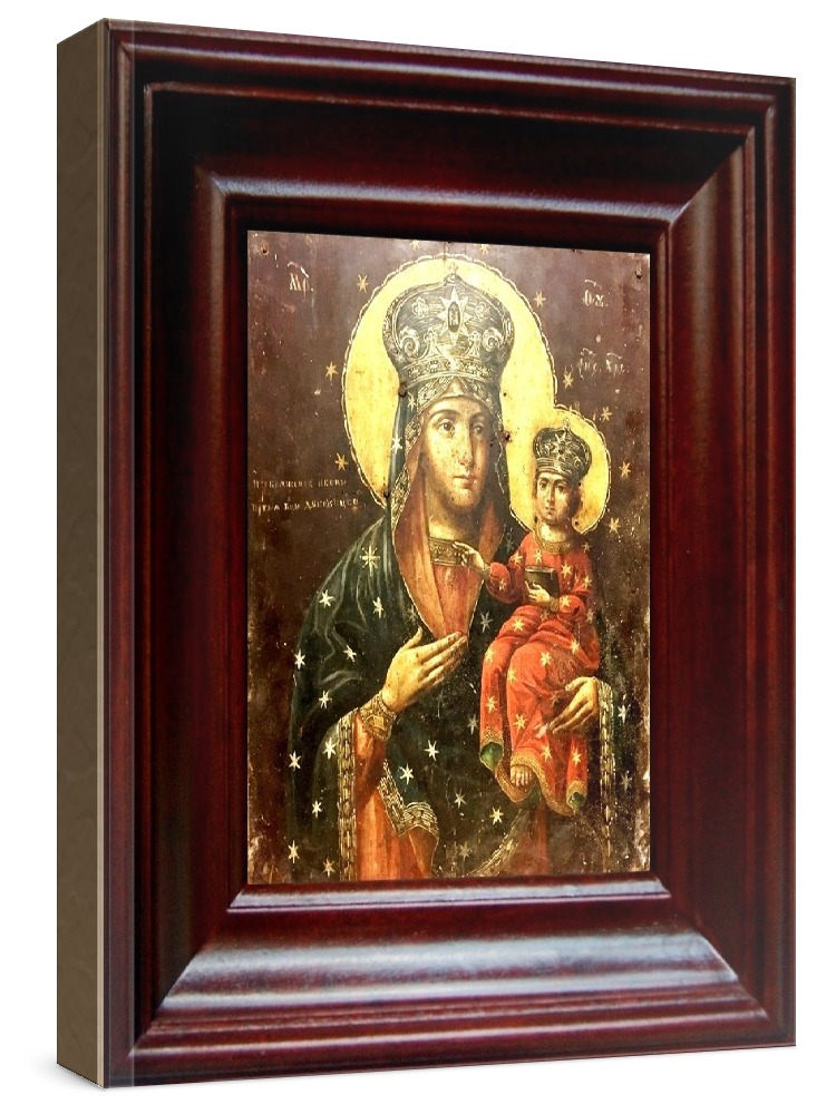 Дубовичская икона бм (21х24), простой киот. Лик нанесен методом шелкографии на цельную липовую доску, покрытую левкасом (специальным грунтом под живопись). Использованы минеральные (природные) краски. Размер иконы без киота (см): 13х16, с киотом: 21х24. Киот со стеклом, выполнен из березы. Икона освящена.