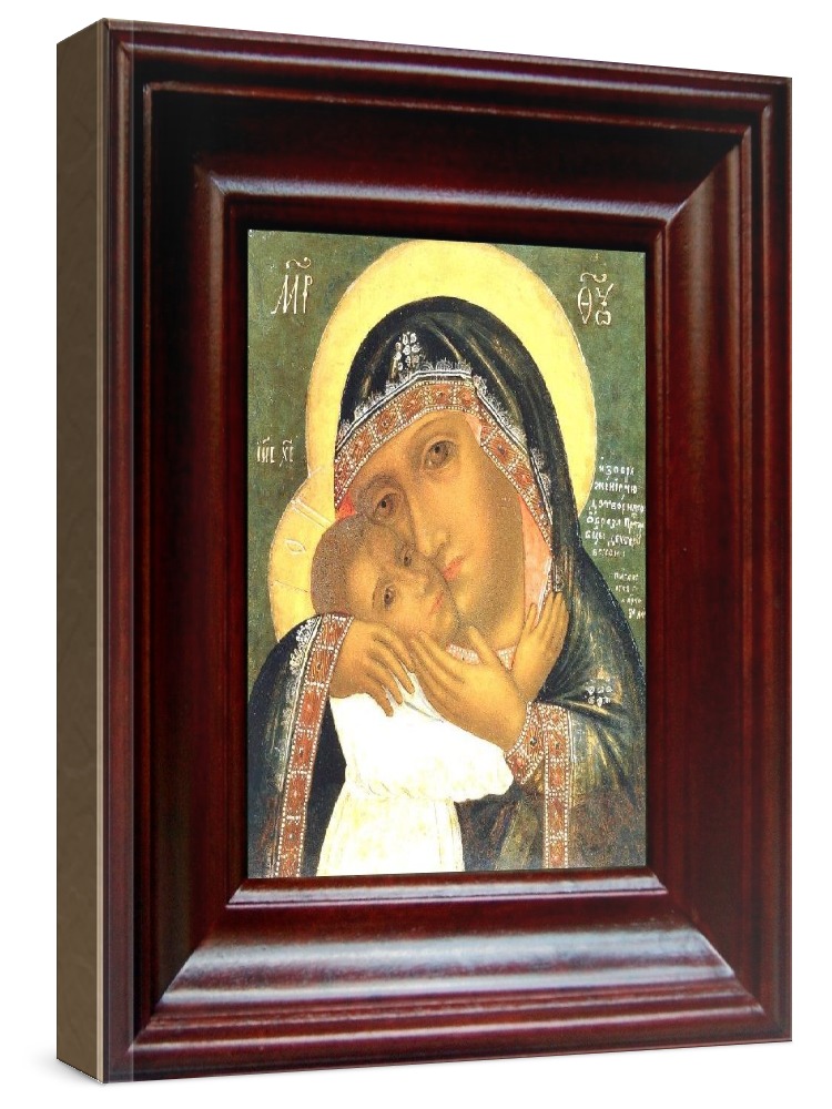Девпетерувская икона бм (21х24), простой киот. Лик нанесен методом шелкографии на цельную липовую доску, покрытую левкасом (специальным грунтом под живопись). Использованы минеральные (природные) краски. Размер иконы без киота (см): 13х16, с киотом: 21х24. Киот со стеклом, выполнен из березы. Икона освящена.