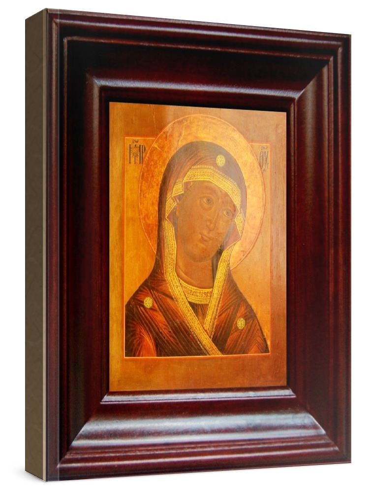 Огневидная икона бм (21х24), простой киот. Лик нанесен методом шелкографии на цельную липовую доску, покрытую левкасом (специальным грунтом под живопись). Использованы минеральные (природные) краски. Размер иконы без киота (см): 13х16, с киотом: 21х24. Киот со стеклом, выполнен из березы. Икона освящена.
