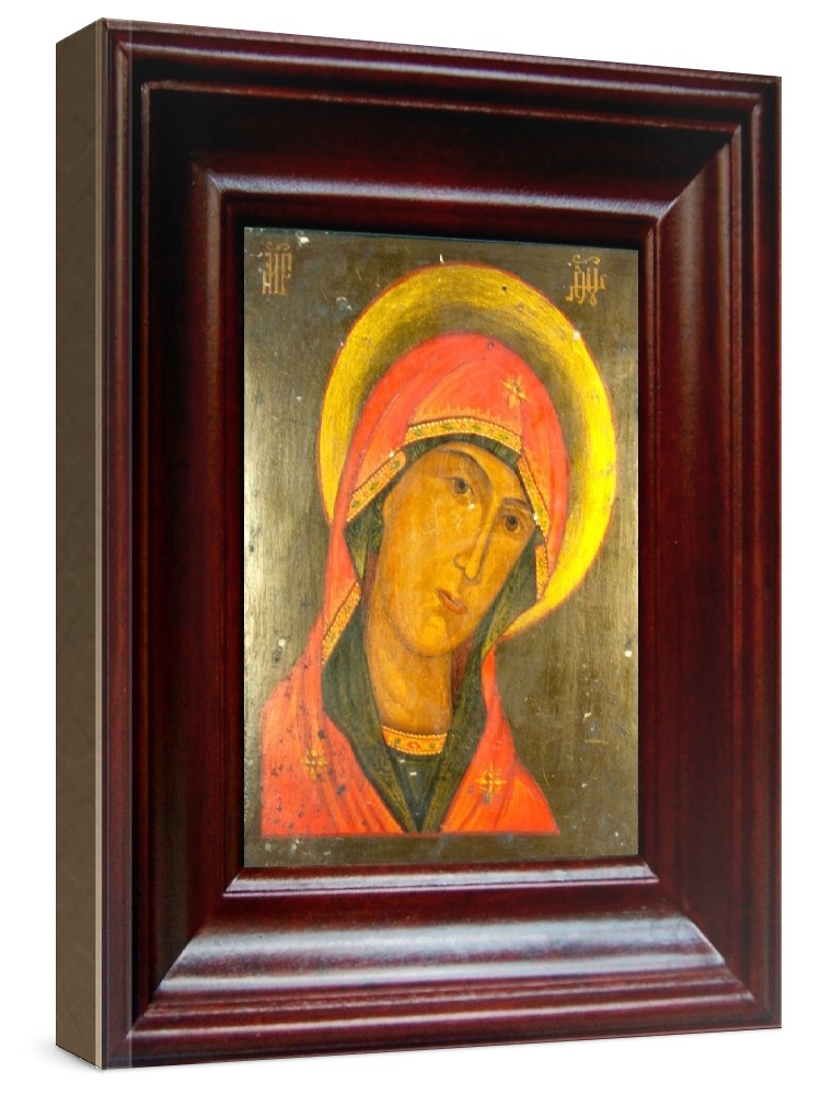 Огневидная икона бм (21х24), простой киот. Лик нанесен методом шелкографии на цельную липовую доску, покрытую левкасом (специальным грунтом под живопись). Использованы минеральные (природные) краски. Размер иконы без киота (см): 13х16, с киотом: 21х24. Киот со стеклом, выполнен из березы. Икона освящена.