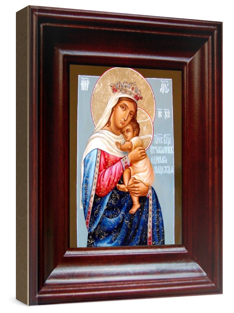 Икона отчаянных единая надежда (21х24), простой киот. Лик нанесен методом шелкографии на цельную липовую доску, покрытую левкасом (специальным грунтом под живопись). Использованы минеральные (природные) краски. Размер иконы без киота (см): 13х16, с киотом: 21х24. Киот со стеклом, выполнен из березы. Икона освящена.