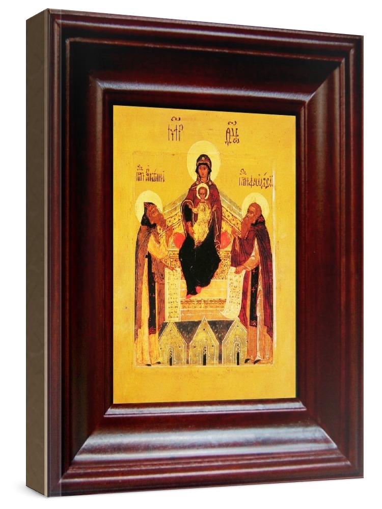 Печерская икона бм (21х24), простой киот. Лик нанесен методом шелкографии на цельную липовую доску, покрытую левкасом (специальным грунтом под живопись). Использованы минеральные (природные) краски. Размер иконы без киота (см): 13х16, с киотом: 21х24. Киот со стеклом, выполнен из березы. Икона освящена.