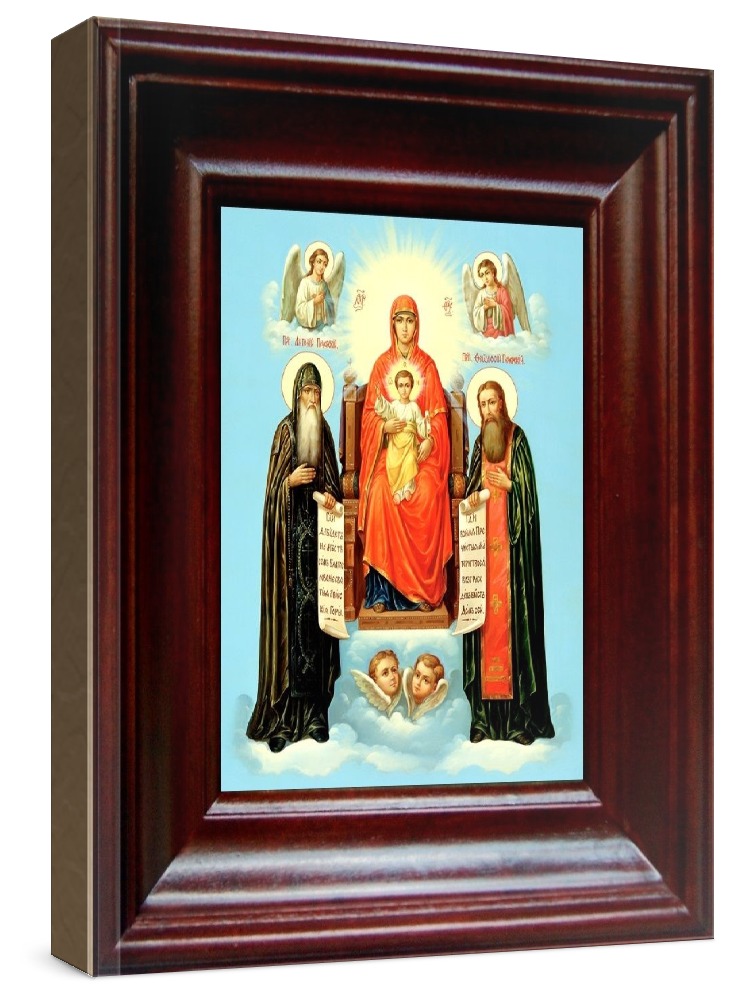 Печерская икона бм (21х24), простой киот. Лик нанесен методом шелкографии на цельную липовую доску, покрытую левкасом (специальным грунтом под живопись). Использованы минеральные (природные) краски. Размер иконы без киота (см): 13х16, с киотом: 21х24. Киот со стеклом, выполнен из березы. Икона освящена.