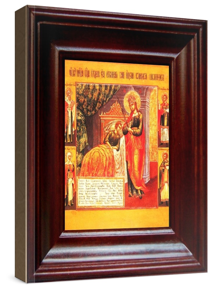 Икона целительница (21х24), простой киот. Лик нанесен методом шелкографии на цельную липовую доску, покрытую левкасом (специальным грунтом под живопись). Использованы минеральные (природные) краски. Размер иконы без киота (см): 13х16, с киотом: 21х24. Киот со стеклом, выполнен из березы. Икона освящена.