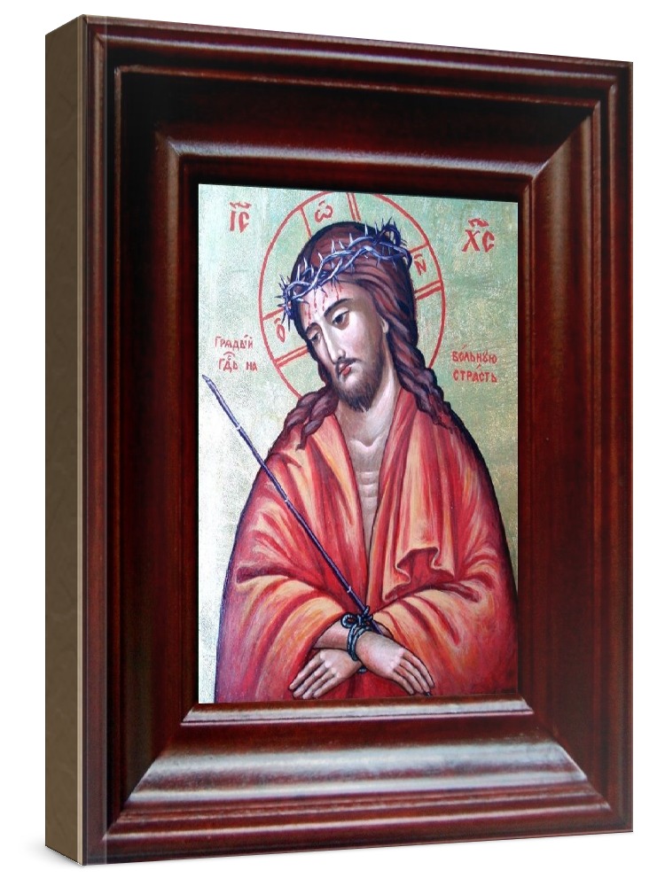 Икона спас в терновом венце (21х24), простой киот. Лик нанесен методом шелкографии на цельную липовую доску, покрытую левкасом (специальным грунтом под живопись). Использованы минеральные (природные) краски. Размер иконы без киота (см): 13х16, с киотом: 21х24. Киот со стеклом, выполнен из березы. Икона освящена.