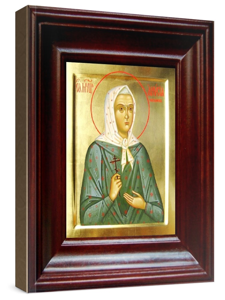Икона анисия масланова (21х24), простой киот. Лик нанесен методом шелкографии на цельную липовую доску, покрытую левкасом (специальным грунтом под живопись). Использованы минеральные (природные) краски. Размер иконы без киота (см): 13х16, с киотом: 21х24. Киот со стеклом, выполнен из березы. Икона освящена.