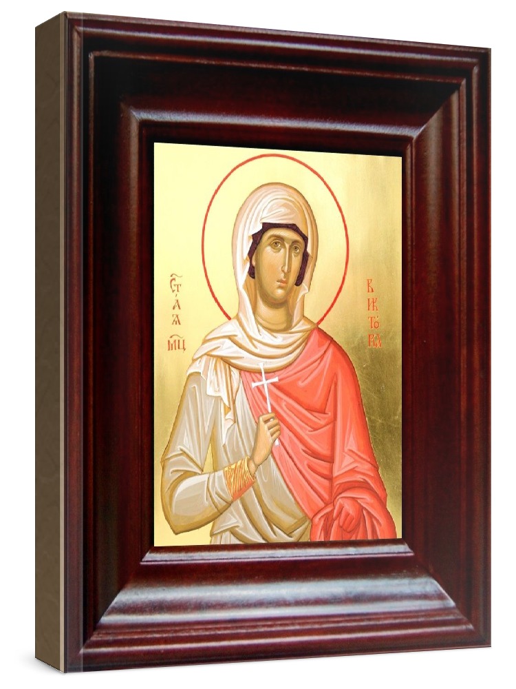 Икона виктория кордувийская (21х24), простой киот. Лик нанесен методом шелкографии на цельную липовую доску, покрытую левкасом (специальным грунтом под живопись). Использованы минеральные (природные) краски. Размер иконы без киота (см): 13х16, с киотом: 21х24. Киот со стеклом, выполнен из березы. Икона освящена.