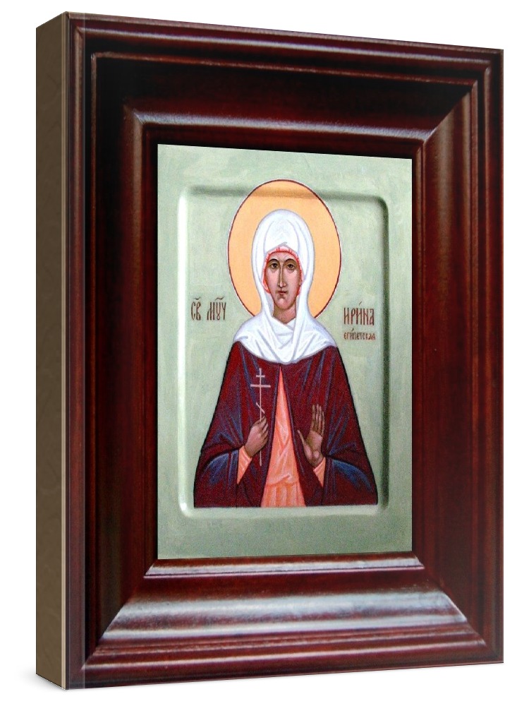 Икона ирина египетская (21х24), простой киот.     Лик нанесен методом шелкографии на цельную липовую доску, покрытую левкасом (специальным грунтом под живопись). Использованы минеральные (природные) краски.  Размер иконы без киота (см): 13х16, с киотом: 21х24.  Киот со стеклом, выполнен из березы.  Икона освящена.