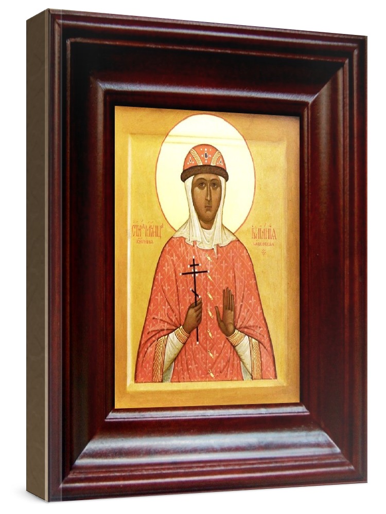 Икона иулиания лазаревская (21х24), простой киот. Лик нанесен методом шелкографии на цельную липовую доску, покрытую левкасом (специальным грунтом под живопись). Использованы минеральные (природные) краски. Размер иконы без киота (см): 13х16, с киотом: 21х24. Киот со стеклом, выполнен из березы. Икона освящена.