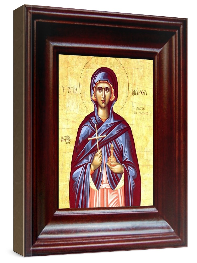 Икона марфа вифанская (21х24), простой киот. Лик нанесен методом шелкографии на цельную липовую доску, покрытую левкасом (специальным грунтом под живопись). Использованы минеральные (природные) краски. Размер иконы без киота (см): 13х16, с киотом: 21х24. Киот со стеклом, выполнен из березы. Икона освящена.