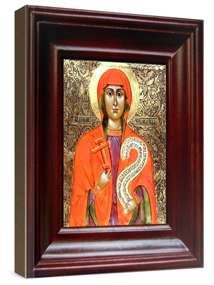 Икона параскева пятница (21х24), простой киот. Лик нанесен методом шелкографии на цельную липовую доску, покрытую левкасом (специальным грунтом под живопись). Использованы минеральные (природные) краски. Размер иконы без киота (см): 13х16, с киотом: 21х24. Киот со стеклом, выполнен из березы. Икона освящена.