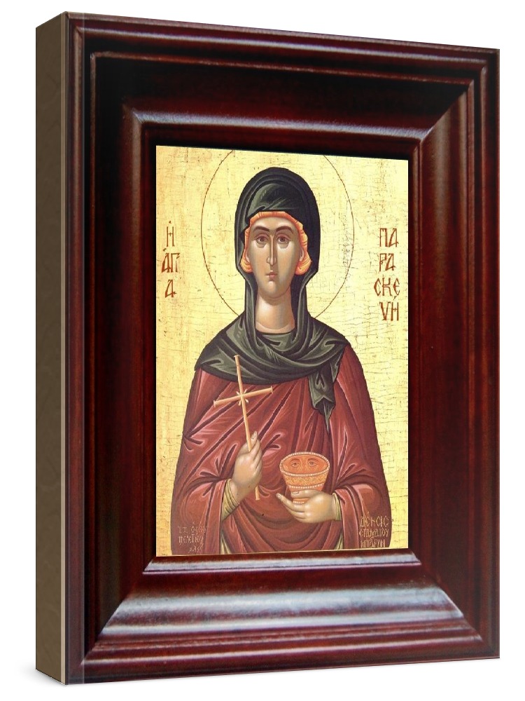 Икона параскева римская (21х24), простой киот. Лик нанесен методом шелкографии на цельную липовую доску, покрытую левкасом (специальным грунтом под живопись). Использованы минеральные (природные) краски. Размер иконы без киота (см): 13х16, с киотом: 21х24. Киот со стеклом, выполнен из березы. Икона освящена.