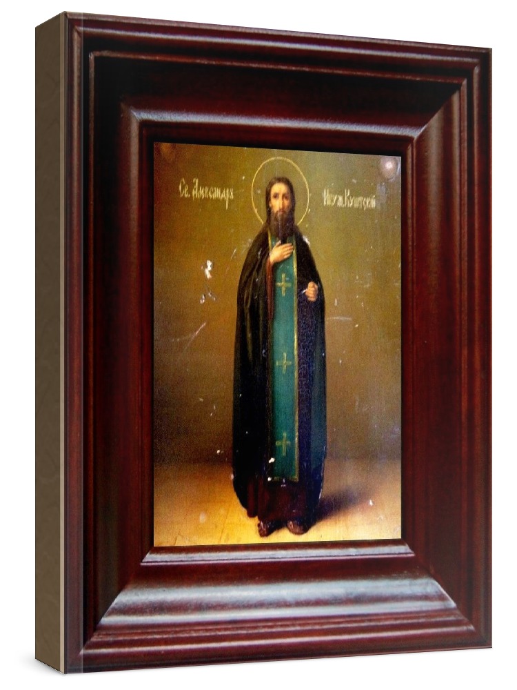 Икона александр куштский (21х24), простой киот. Лик нанесен методом шелкографии на цельную липовую доску, покрытую левкасом (специальным грунтом под живопись). Использованы минеральные (природные) краски. Размер иконы без киота (см): 13х16, с киотом: 21х24. Киот со стеклом, выполнен из березы. Икона освящена.