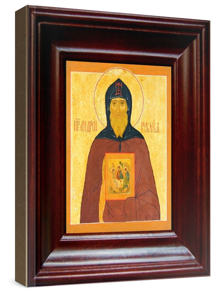 Икона андрей рублев (21х24), простой киот. Лик нанесен методом шелкографии на цельную липовую доску, покрытую левкасом (специальным грунтом под живопись). Использованы минеральные (природные) краски. Размер иконы без киота (см): 13х16, с киотом: 21х24. Киот со стеклом, выполнен из березы. Икона освящена.