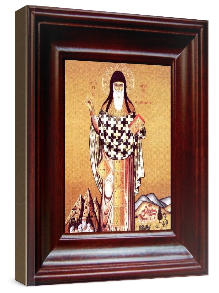 Икона арсений каппадокийский (21х24), простой киот. Лик нанесен методом шелкографии на цельную липовую доску, покрытую левкасом (специальным грунтом под живопись). Использованы минеральные (природные) краски. Размер иконы без киота (см): 13х16, с киотом: 21х24. Киот со стеклом, выполнен из березы. Икона освящена.