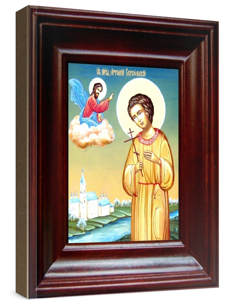 Икона артемий веркольский (21х24), простой киот. Лик нанесен методом шелкографии на цельную липовую доску, покрытую левкасом (специальным грунтом под живопись). Использованы минеральные (природные) краски. Размер иконы без киота (см): 13х16, с киотом: 21х24. Киот со стеклом, выполнен из березы. Икона освящена.