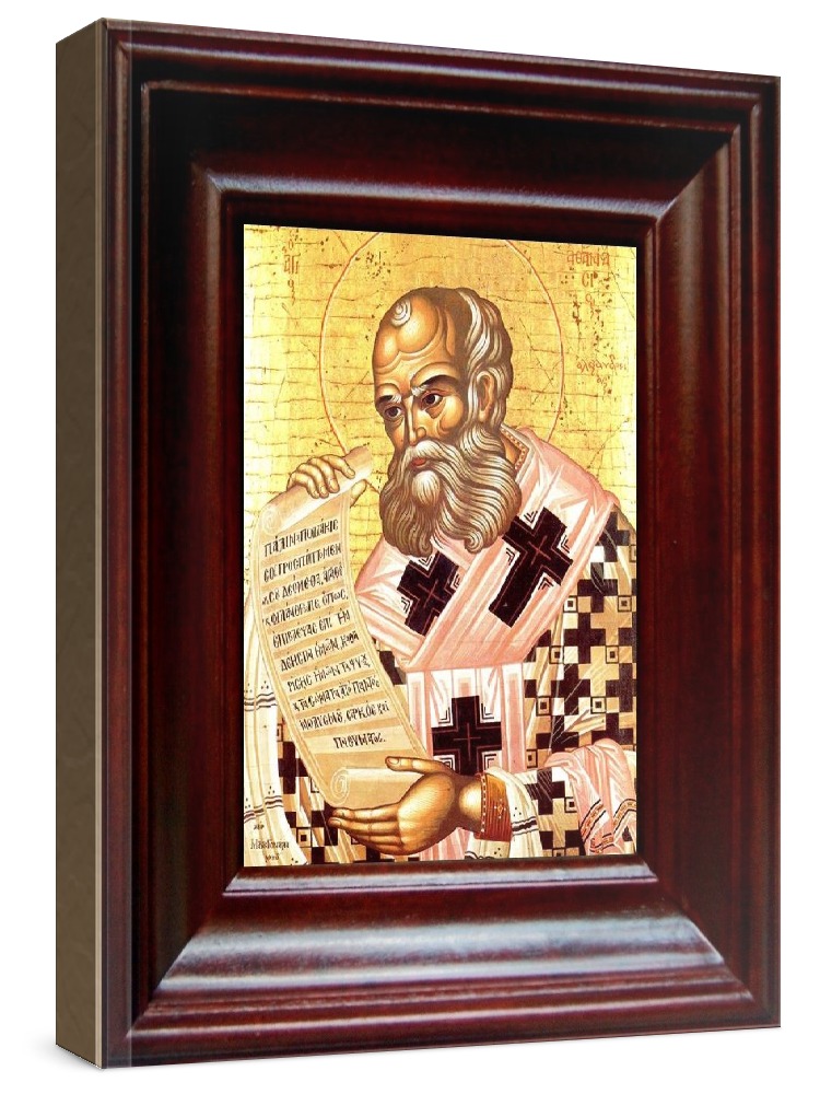 Икона афанасий великий (21х24), простой киот. Лик нанесен методом шелкографии на цельную липовую доску, покрытую левкасом (специальным грунтом под живопись). Использованы минеральные (природные) краски. Размер иконы без киота (см): 13х16, с киотом: 21х24. Киот со стеклом, выполнен из березы. Икона освящена.