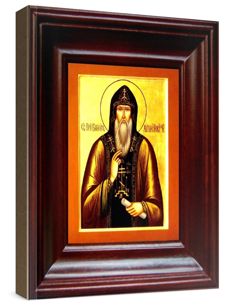 Икона варлаам хутынский (21х24), простой киот. Лик нанесен методом шелкографии на цельную липовую доску, покрытую левкасом (специальным грунтом под живопись). Использованы минеральные (природные) краски. Размер иконы без киота (см): 13х16, с киотом: 21х24. Киот со стеклом, выполнен из березы. Икона освящена.