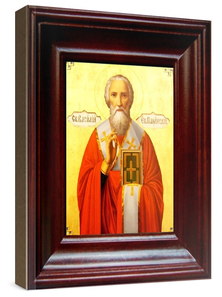 Икона василий парийский (21х24), простой киот. Лик нанесен методом шелкографии на цельную липовую доску, покрытую левкасом (специальным грунтом под живопись). Использованы минеральные (природные) краски. Размер иконы без киота (см): 13х16, с киотом: 21х24. Киот со стеклом, выполнен из березы. Икона освящена.