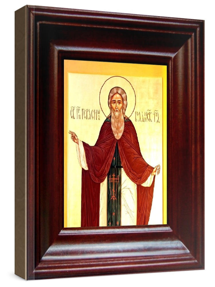 Икона герасим болдинский (21х24), простой киот. Лик нанесен методом шелкографии на цельную липовую доску, покрытую левкасом (специальным грунтом под живопись). Использованы минеральные (природные) краски. Размер иконы без киота (см): 13х16, с киотом: 21х24. Киот со стеклом, выполнен из березы. Икона освящена.
