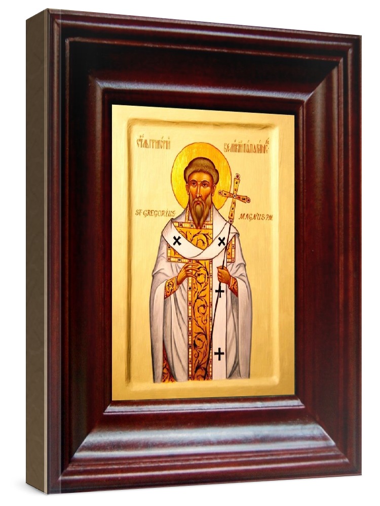 Икона григорий двоеслов (21х24), простой киот. Лик нанесен методом шелкографии на цельную липовую доску, покрытую левкасом (специальным грунтом под живопись). Использованы минеральные (природные) краски. Размер иконы без киота (см): 13х16, с киотом: 21х24. Киот со стеклом, выполнен из березы. Икона освящена.