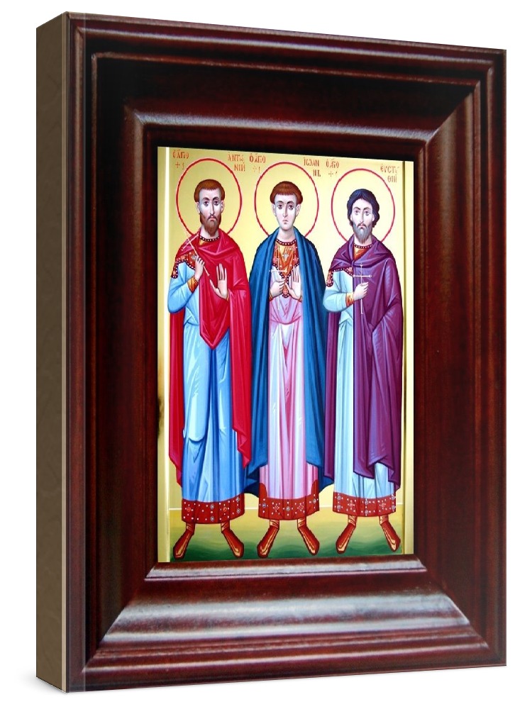 Икона антоний, иоанн и евстафий виленские (21х24), простой киот. Лик нанесен методом шелкографии на цельную липовую доску, покрытую левкасом (специальным грунтом под живопись). Использованы минеральные (природные) краски. Размер иконы без киота (см): 13х16, с киотом: 21х24. Киот со стеклом, выполнен из березы. Икона освящена.