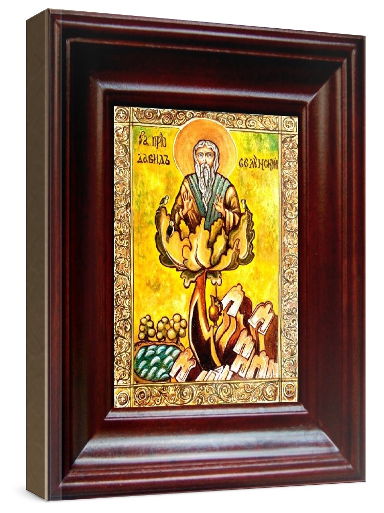 Икона давид солунский (21х24), простой киот. Лик нанесен методом шелкографии на цельную липовую доску, покрытую левкасом (специальным грунтом под живопись). Использованы минеральные (природные) краски. Размер иконы без киота (см): 13х16, с киотом: 21х24. Киот со стеклом, выполнен из березы. Икона освящена.