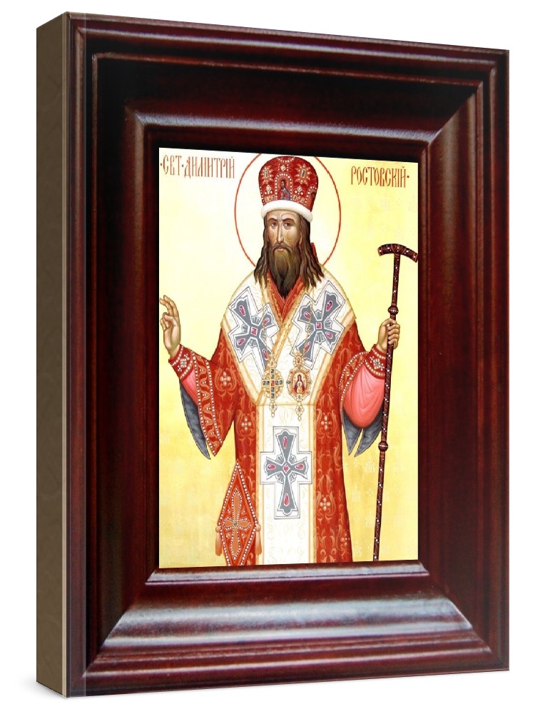 Икона димитрий ростовский (21х24), простой киот. Лик нанесен методом шелкографии на цельную липовую доску, покрытую левкасом (специальным грунтом под живопись). Использованы минеральные (природные) краски. Размер иконы без киота (см): 13х16, с киотом: 21х24. Киот со стеклом, выполнен из березы. Икона освящена.