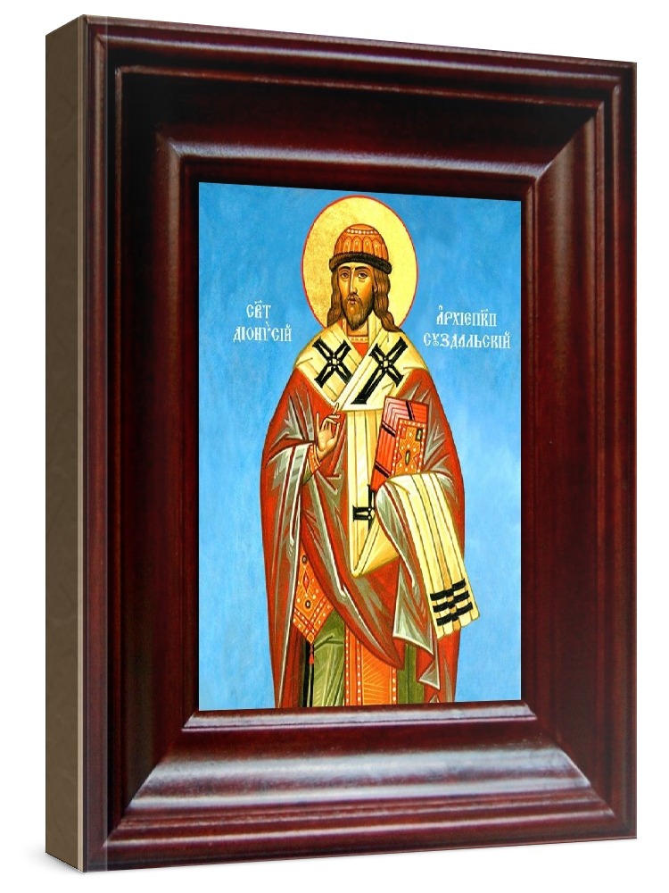 Икона дионисий суздальский (21х24), простой киот. Лик нанесен методом шелкографии на цельную липовую доску, покрытую левкасом (специальным грунтом под живопись). Использованы минеральные (природные) краски. Размер иконы без киота (см): 13х16, с киотом: 21х24. Киот со стеклом, выполнен из березы. Икона освящена.