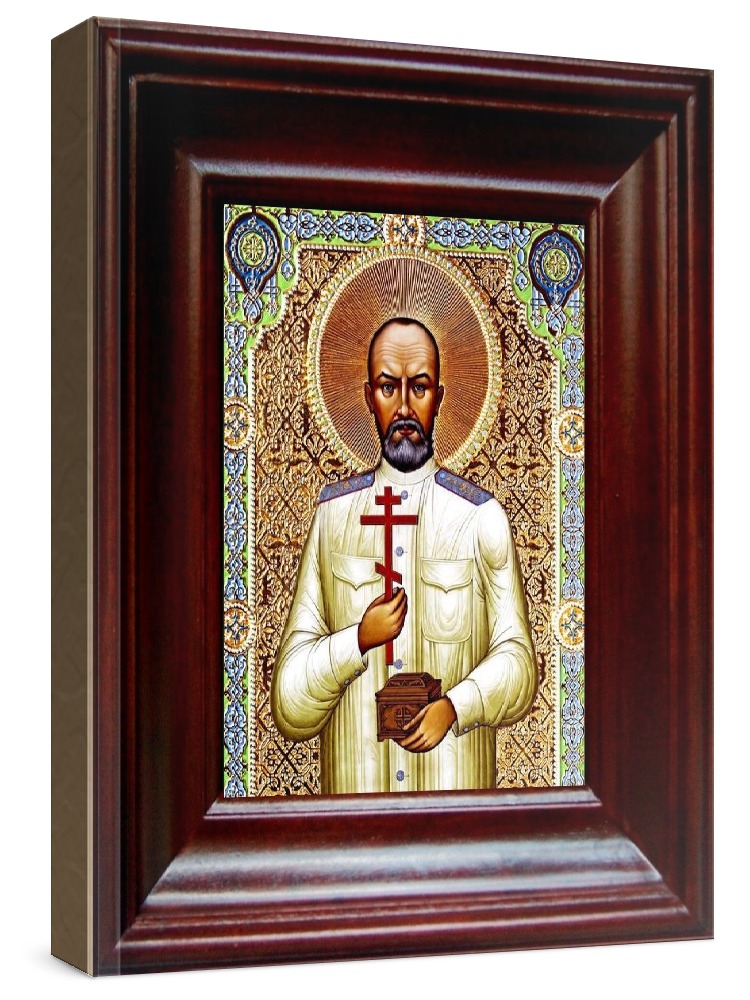Икона евгений боткин (21х24), простой киот. Лик нанесен методом шелкографии на цельную липовую доску, покрытую левкасом (специальным грунтом под живопись). Использованы минеральные (природные) краски. Размер иконы без киота (см): 13х16, с киотом: 21х24. Киот со стеклом, выполнен из березы. Икона освящена.