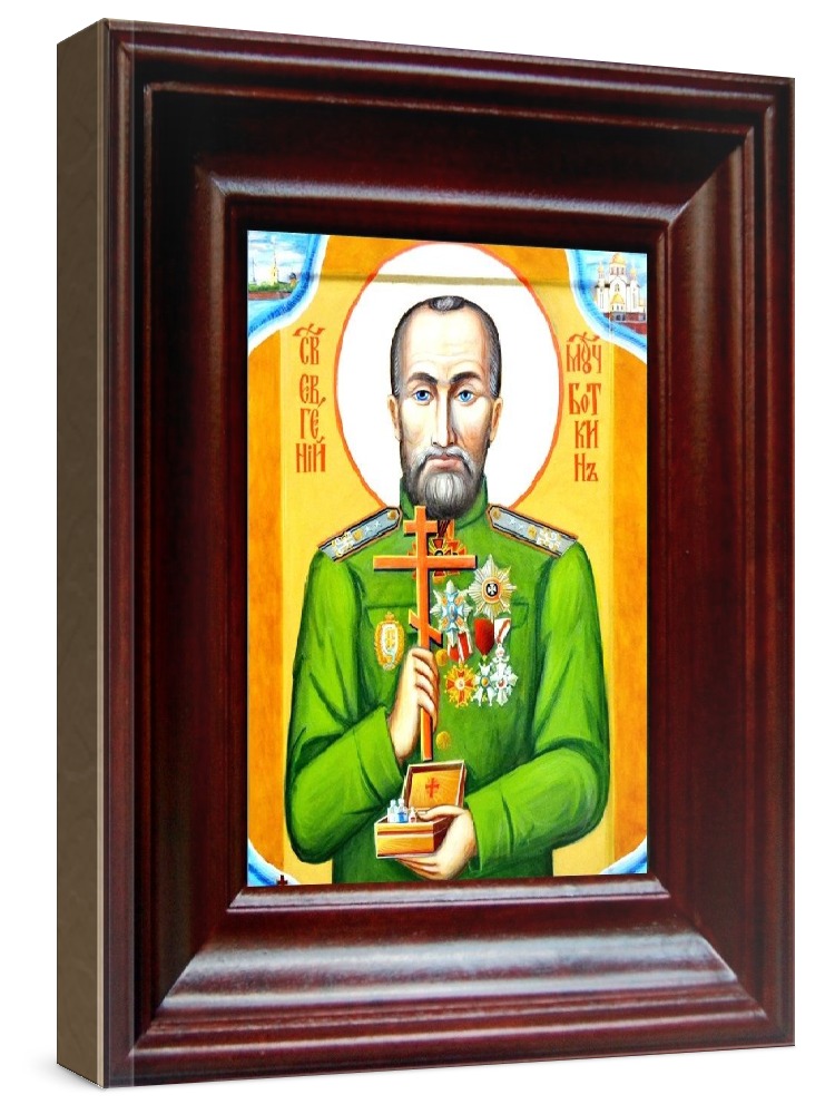 Икона евгений боткин (21х24), простой киот. Лик нанесен методом шелкографии на цельную липовую доску, покрытую левкасом (специальным грунтом под живопись). Использованы минеральные (природные) краски. Размер иконы без киота (см): 13х16, с киотом: 21х24. Киот со стеклом, выполнен из березы. Икона освящена.