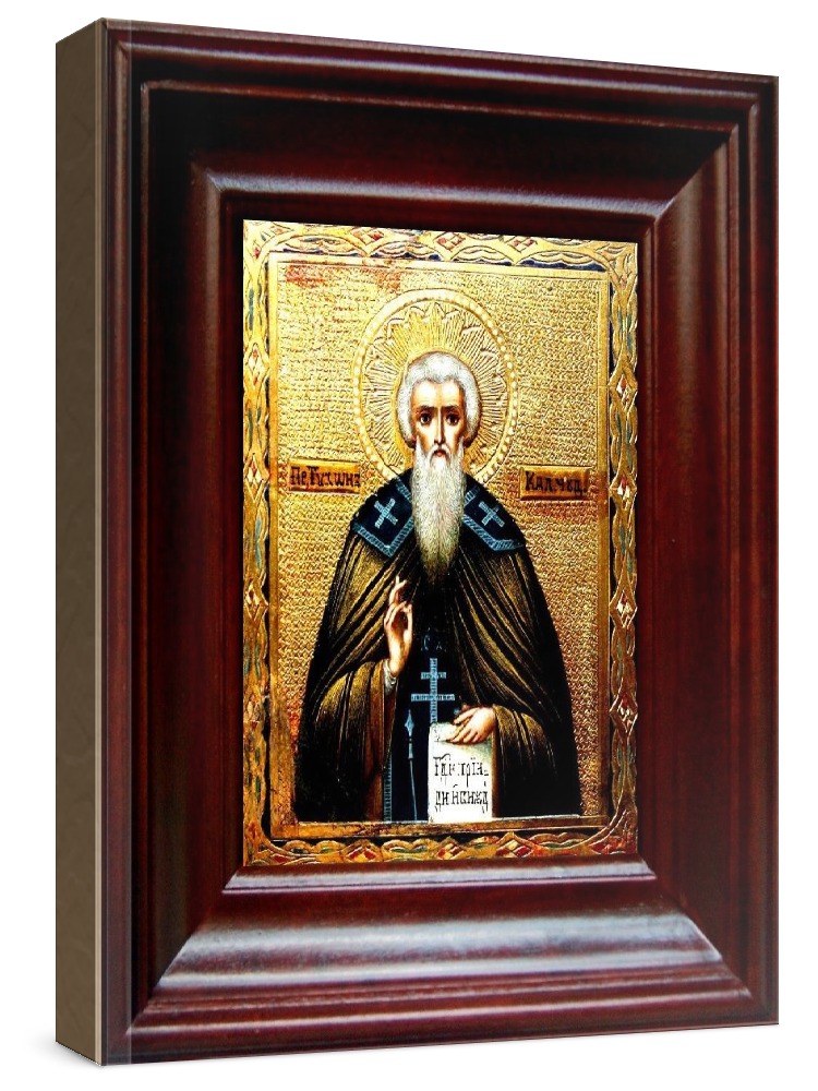 Икона тихон калужский (21х24), простой киот. Лик нанесен методом шелкографии на цельную липовую доску, покрытую левкасом (специальным грунтом под живопись). Использованы минеральные (природные) краски. Размер иконы без киота (см): 13х16, с киотом: 21х24. Киот со стеклом, выполнен из березы. Икона освящена.