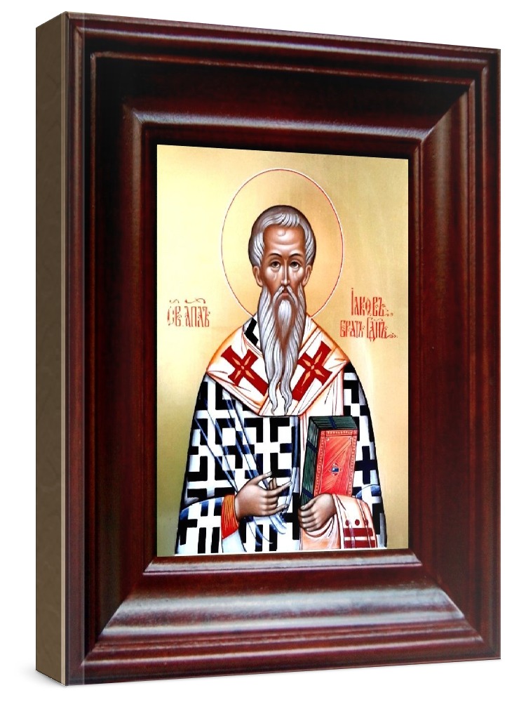 Икона иаков, брат господень (21х24), простой киот. Лик нанесен методом шелкографии на цельную липовую доску, покрытую левкасом (специальным грунтом под живопись). Использованы минеральные (природные) краски. Размер иконы без киота (см): 13х16, с киотом: 21х24. Киот со стеклом, выполнен из березы. Икона освящена.