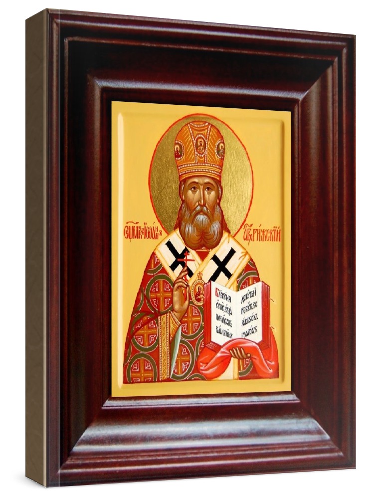 Икона иоанн рижский (21х24), простой киот. Лик нанесен методом шелкографии на цельную липовую доску, покрытую левкасом (специальным грунтом под живопись). Использованы минеральные (природные) краски. Размер иконы без киота (см): 13х16, с киотом: 21х24. Киот со стеклом, выполнен из березы. Икона освящена.