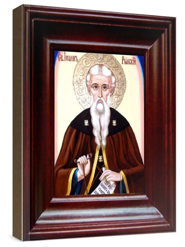 Икона иоанн рыльский (21х24), простой киот. Лик нанесен методом шелкографии на цельную липовую доску, покрытую левкасом (специальным грунтом под живопись). Использованы минеральные (природные) краски. Размер иконы без киота (см): 13х16, с киотом: 21х24. Киот со стеклом, выполнен из березы. Икона освящена.