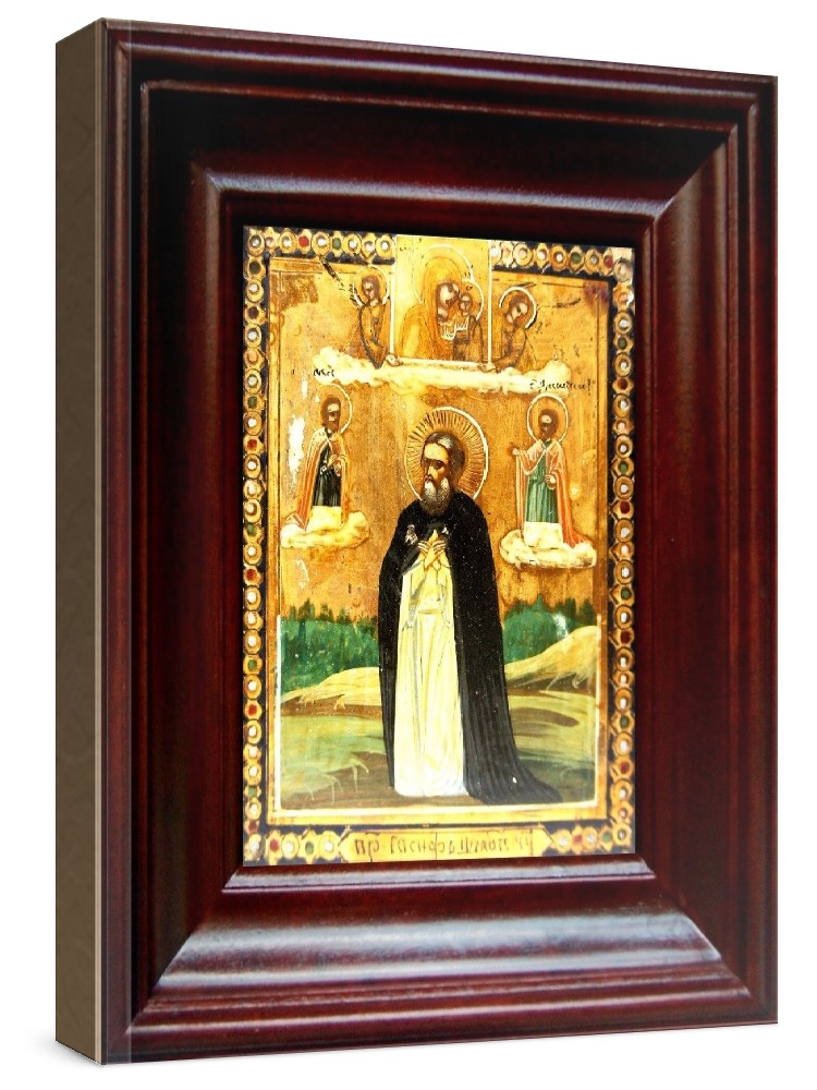 Икона иосиф вологодский (21х24), простой киот. Лик нанесен методом шелкографии на цельную липовую доску, покрытую левкасом (специальным грунтом под живопись). Использованы минеральные (природные) краски. Размер иконы без киота (см): 13х16, с киотом: 21х24. Киот со стеклом, выполнен из березы. Икона освящена.