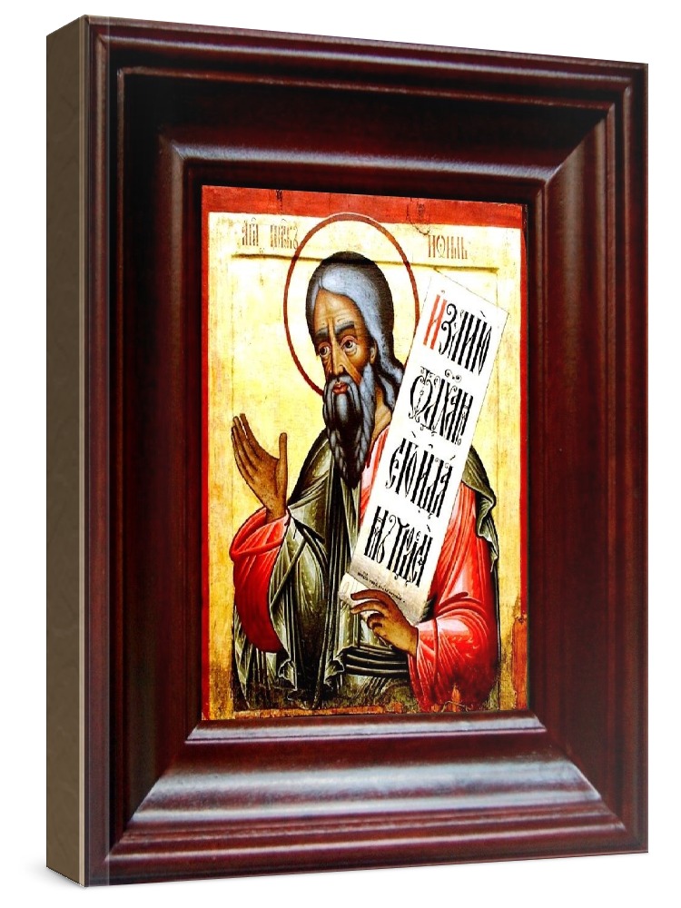 Икона пророк иоиль (21х24), простой киот. Лик нанесен методом шелкографии на цельную липовую доску, покрытую левкасом (специальным грунтом под живопись). Использованы минеральные (природные) краски. Размер иконы без киота (см): 13х16, с киотом: 21х24. Киот со стеклом, выполнен из березы. Икона освящена.