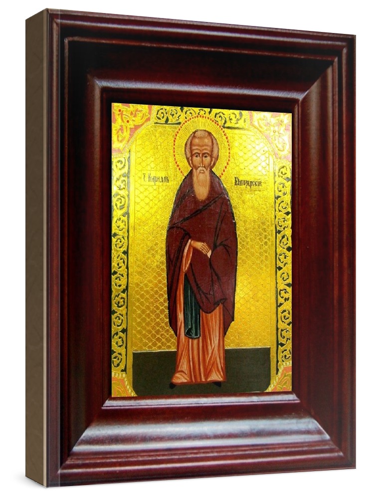 Икона кирилл белозерский (21х24), простой киот. Лик нанесен методом шелкографии на цельную липовую доску, покрытую левкасом (специальным грунтом под живопись). Использованы минеральные (природные) краски. Размер иконы без киота (см): 13х16, с киотом: 21х24. Киот со стеклом, выполнен из березы. Икона освящена.